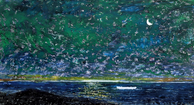 그들이 떠나온 섬의 언덕이 하얀 조각달 아래 조용히 앉아있다. 하얀 새떼들이 섬 주위를 포위하듯이 낮은 하늘에 모여있다. 바위 위에서는 작은 별들이 서로를 속삭이듯 옹기종기 붙어있다.