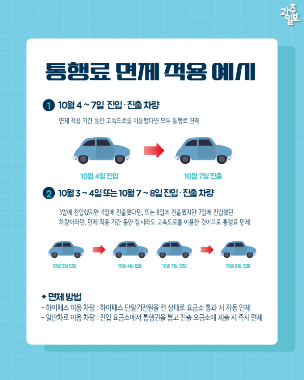 통행료 면제는 10월 4일 00시부터 10월 7일 24시 사이에 잠깐이라도 고속도로를 이용한 차량이라면 적용된다.