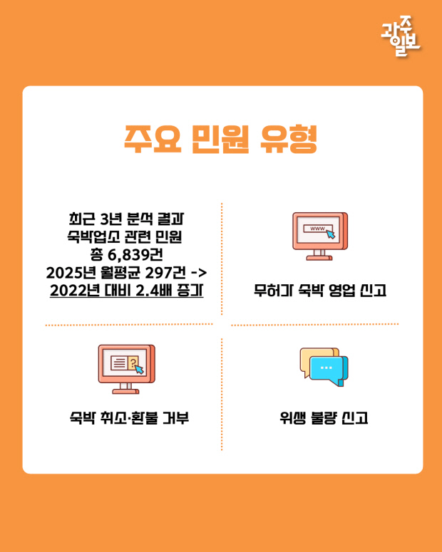 국민권익위원회가 최근 3년간(2022년 9월~2025년 8월) 숙박업소 관련 민원 6839건을 분석한 결과, 무허가 영업·숙박 취소 및 환불 거부·위생 불량 등의 민원이 급증했다.