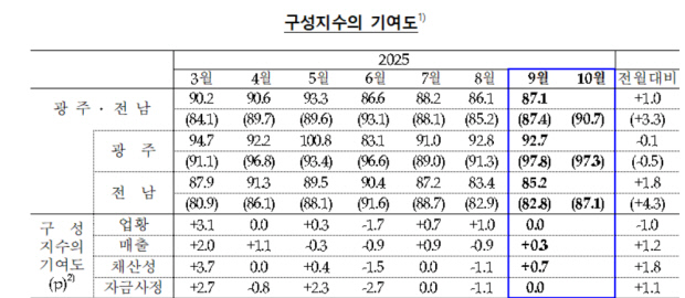 같은 기간 광주·전남 비제조업CBSI는 1.0p 상승한 87.1을 기록했다. 비제조업은 구성지수별로 매출(+1.2p), 채산성(+0.7p), 자금사정(+1.1p)이 모두 올랐지만, 업황(-1.0p)만 하락했다.