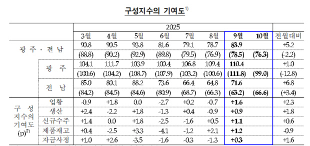 2025년 9월 광주·전남지역 제조업 구성지수의 기여도 표.<한국은행 광주전남본부 제공>