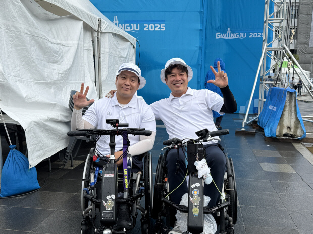 ![]() 28일 광주시 동구 5·18민주광장에서 열린 2025 세계장애인양궁선수권대회에서 한국 리커브 남자 복식 대표팀 이지훈(왼쪽)·김정훈 조가 포즈를 취하고 있다. |