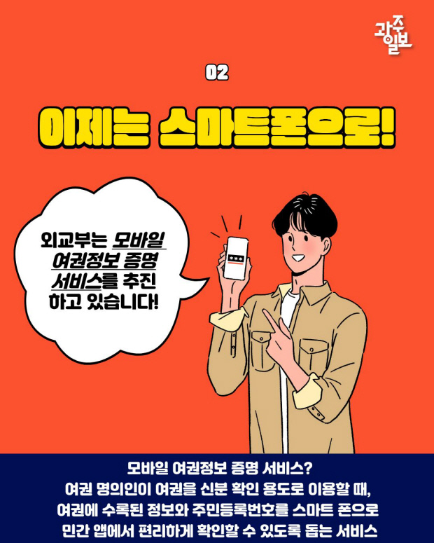 외교부는 2026년 상반기부터 ‘모바일 여권정보 증명서비스’를 민간에 개방해 스마트폰 앱을 통해 여권 정보를 이용한 신분 확인이 가능하도록 할 계획이다.