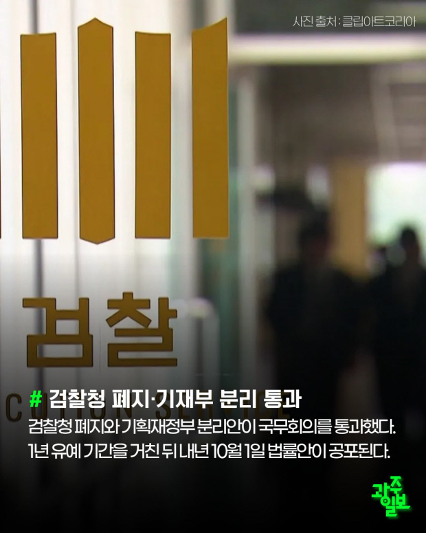 검찰청 폐지와 기획재정부 분리안이 국무회의를 통과했다. 1년 유예 기간을 거친 뒤 내년 10월 1일 법률안이 공포된다.