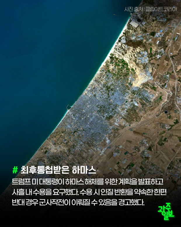 트럼프 미 대통령이 하마스 해체를 위한 계획을 발표하고 사흘 내 수용을 요구했다. 수용 시 인질 반환을 약속한 한편 반대 경우 군사작전이 이뤄질 수 있음을 경고했다.