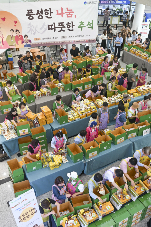 ![]() 추석 명절을 앞둔 30일 광주 서구청 1층 로비에서 서구 아너스와 이웃돌봄단체 회원들이 소외계층 1인가구를 위한 ‘이웃 온(on) 데이 돌봄키트’를 제작하고 있다. 이날 완성된 명절선물꾸러미는 지역의 홀몸 어르신 등 2,100여 가구에 전달될 예정이다. /김진수 기자 jeans@kwangju.co.kr |