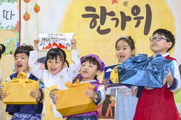![]() 추석 명절을 앞둔 1일 광주시 북구 중흥동 중흥하나 어린이집 원생들이 한복을 곱게 차려입고 송편과 선물을 들며 ‘행복한 명절 되세요’라는 메시지를 전하고 있다. /김진수 기자 jeans@kwangju.co.kr |