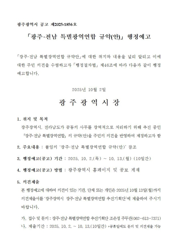 이번 행정예고는 연내 특별광역연합 출범을 위한 첫 공식 관문이다.