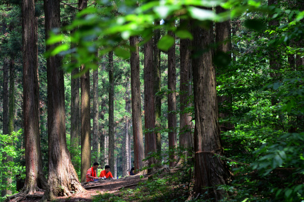 장성 축령산 휴양림을 찾은 산행객들이 녹음이 우거진 편백나무 아래에서 휴식하고 있다. /김진수기자 jeans@kwangju.co.kr