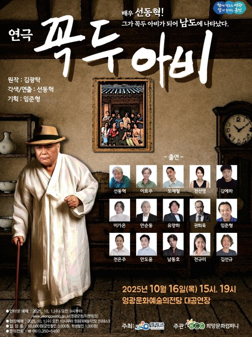광주희망문화컴퍼니가 제작한 연극 ‘꼭두아비’가 오는 16일 오후 3시와 7시 두 차례에 걸쳐 영광예술의전당 대공연장 무대에 오른다. 아버지 세대의 희생과 고단한 삶을 호남식 넋두리로 풀어낸 코믹 드라마로, 한 가족 안에서 벌어지는 갈등과 화해를 통해 ‘돈’이라는 현실적 욕망과 인간의 존엄이라는 본질적 가치를 되묻는다.