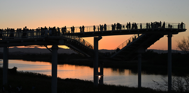 ![]() 11일 광주시 서구 서창들녘 인근 영산강변 ‘감성조망대’에서 시민들이 노을이 번지는 강물을 바라보며 가을 정취를 즐기고 있다. 지난 1일 문을 연 조망대는 영산강변 황혼·야경을 한눈에 담을 수 있는 전망 명소가 될 것으로 기대를 모으고 있다. /나명주 기자 mjna@kwangju.co.kr/나명주기자mjna@kwangju.co.kr |