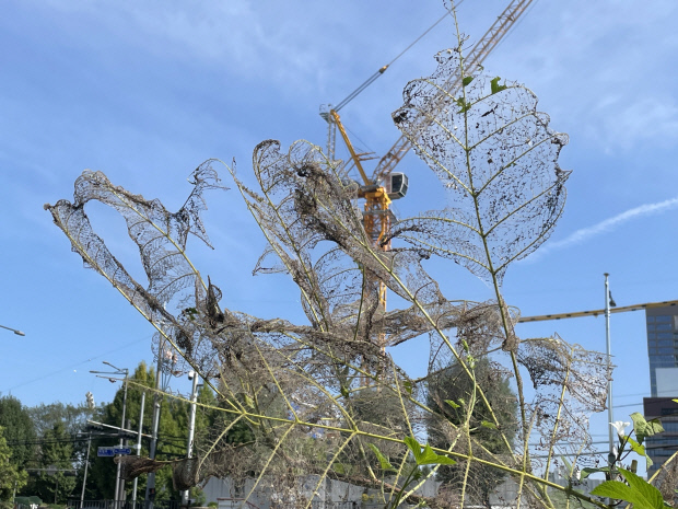 서구 천변좌로 인근 나무 잎이 미국흰불나방이 갉아먹은 뒤 잎맥만 남아 있다. /김진아 기자 jinggi@
