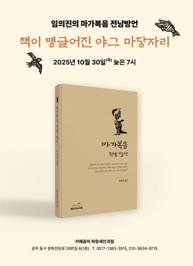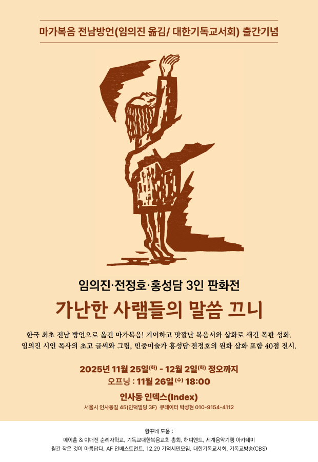 한편 ‘책이 맹글어진 야그 마당자리’(출판기념회)가 오는 30일(오후 7시) 광주시 동구 카페꼼마 파랑새안과점에서 열린다. 또한 서울 인사동 인덱스에서는 오는 11월 25일~12월 2일 ‘임의진·전정호·홍성담 3인 판화전-가난한 사램들의 말씀 끄니’가 열린다. 개막식은 오는 11월 26일 오전 6시.