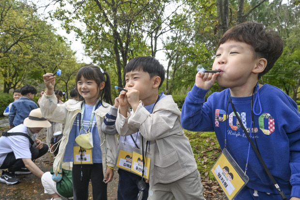 ![]() 14일 오전 광주시 북구 충효동 광주호수생태원에서 열린 ‘유아 기후·생태 놀이교실’에 참가한 어린이들이 나뭇가지를 입에 물고 식물의 영양분 이동 원리를 배우고 있다. /김진수 기자 jeans@kwangju.co.kr |