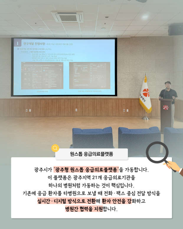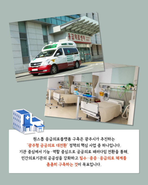 광주시는 ‘광주형 원스톱 응급의료플랫폼’을 가동합니다. 이 플랫폼은 광주지역 21개 응급의료기관을 하나의 병원처럼 가동하는 것이 핵심입니다. 기존에 응급 환자를 타병원으로 보낼 때 전화·팩스 중심 전달 방식을 실시간·디지털 방식으로 전환해 환자 안전을 강화하고 병원간 협력을 지원합니다.
