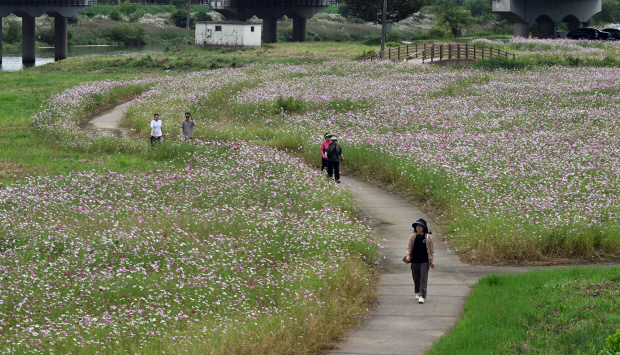 ![]() 16일 오전 광주시 광산구 첨단대교 아래 영산강변에 코스모스가 만개한 가운데 시민들이 산책로를 걷고 있다. /나명주 기자 mjna@kwangju.co.kr |