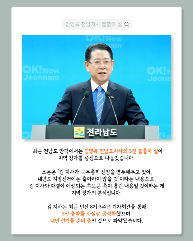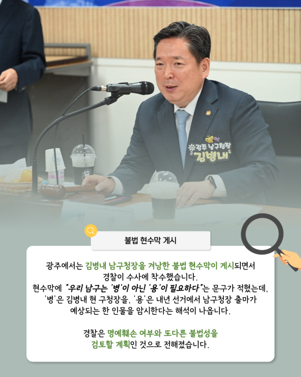 한편, 현직 단체장의 불출마설도 지역 정가에 퍼지고 있습니다. 최근 전남도 안팎에서는 김영록 전남도지사의 3선 불출마설이 돌고 있으며, 광주에서는 김병내 남구청장을 겨냥한 불법 현수막이 게시돼 경찰이 수사에 착수했습니다.