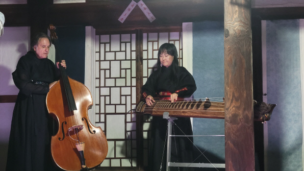 10일 나주 남파고택에서 열린 ‘제1회 프랑스의 가을’ 행사에서 전자 거문고와 더블베이스를 연주하는 이정주씨와 마리 시몽. /김미은 기자 mekim@kwangju.co.kr