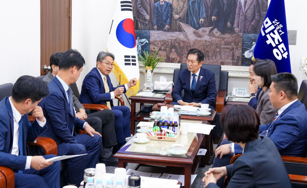 강기정 광주시장이 22일 오전 서울 국회본관에서 정청래 더불어민주당 대표를 만나 이재명 대통령의 제1호 공약이자 국정운영 5개년 계획에 포함된 ‘국가AI컴퓨팅센터 광주 설립’ 이행을 촉구하고 있다. <광주시 제공>