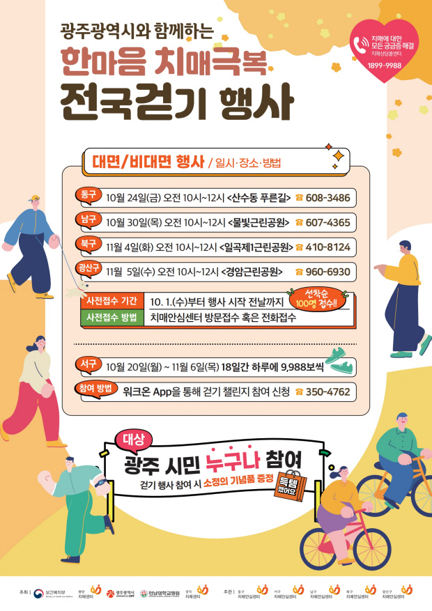 23일 광주시에 따르면 치매 인식 개선과 예방 실천 확산을 위해 24일부터 11월 5일까지 자치구별 ‘2025 한마음 치매극복 걷기행사’가 열린다.