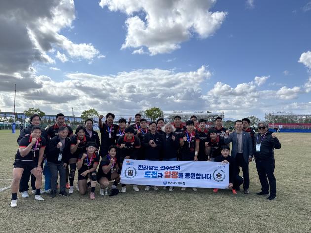 ![]() 한국전력 럭비팀이 23일 삼락생태공원축구장에서 열린 포스코이앤씨와의 전국체전 럭비 일반부 결승전 후 은메달을 목에 걸고 포즈를 취하고 있다. <전남도체육회 제공> |