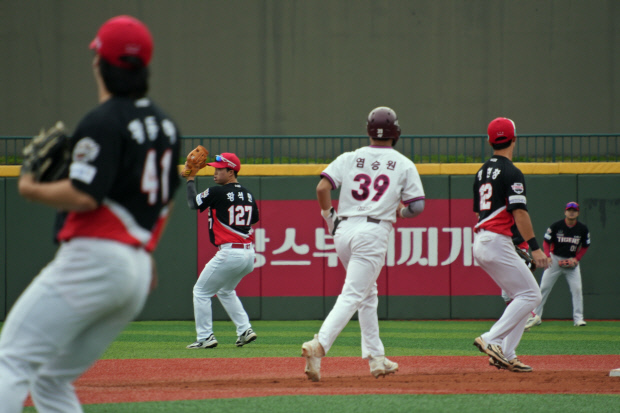 황동화가 1회말 고양 염승원의 1루 땅볼 때 박상준에게 공을 넘겨 받기 위해 베이스 커버를 들어가고 있다. |