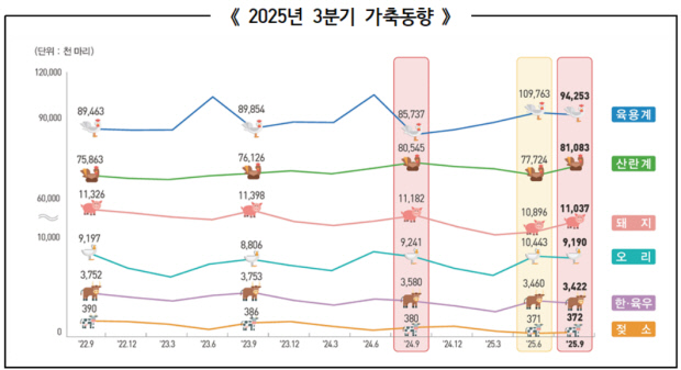 ![]() 분기별 가축별 사육마릿수 그래픽<국가데이터처 제공> |