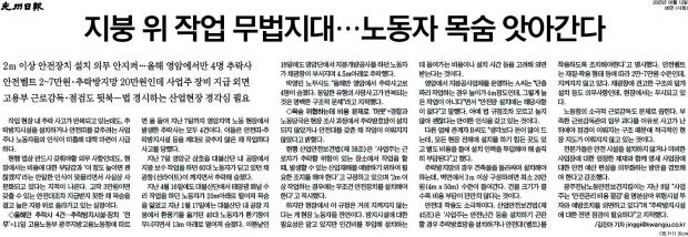 한편 올해 광주·전남에서는 7명의 노동자가 고소 작업을 하다 추락해 숨졌다. 특히 영암 대불산단에서만 4명의 노동자가 지붕, 태양광 등 위에서 작업을 하다 떨어졌다.