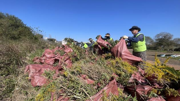 작업자 130명과 2m 풀 뽑기 ‘실랑이’…한 시간 만에 3t 수거