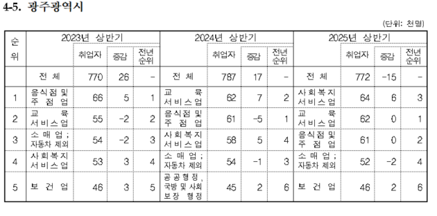 ![]() 광주시 2023~2025년 상반기 직군별 취업자 수 및 순위 표<국가데이터처 제공> |