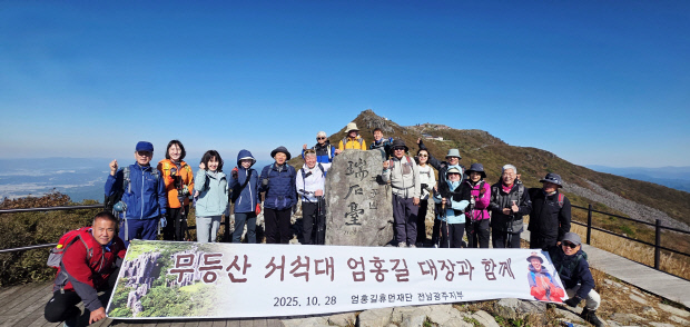 엄홍길휴먼재단 광주·전남지부(지부장 장창호)는 지난 28일 세계 최초의 히말라야 8000m 16좌 완등자인 엄홍길 대장과 함께 무등산 옛길 2구간에서 회원 합동 산행을 했다.<사진>