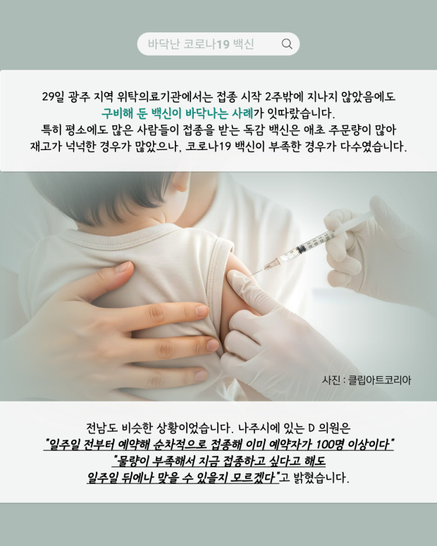 29일 광주 지역 위탁의료기관에서는 접종 시작 2주밖에 지나지 않았음에도 구비해 둔 백신이 바닥나는 사례가 잇따랐습니다.