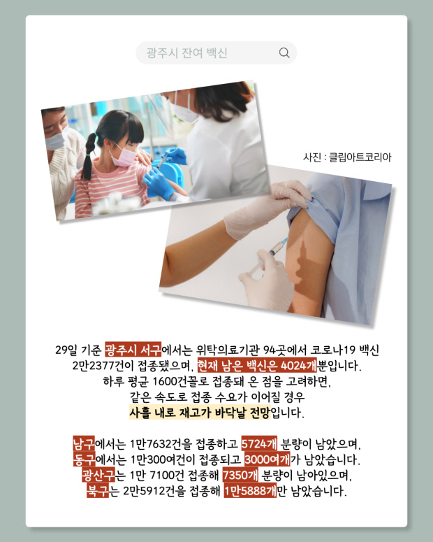 남구에서는 1만7632건을 접종하고 5724개 분량이 남았으며, 동구에서는 1만300여건이 접종되고 3000여개가 남았습니다. 광산구는 1만 7100건 접종해 7350개 분량이 남아있으며, 북구는 2만5912건을 접종해 1만5888개만 남았습니다.