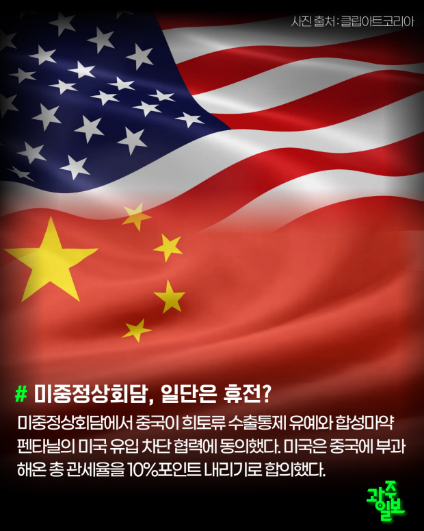 미중정상회담에서 중국이 희토류 수출통제 유예와 합성마약 펜타닐의 미국 유입 차단 협력에 동의했다. 미국은 중국에 부과해온 총 관세율을 10%포인트 내리기로 합의했다.
