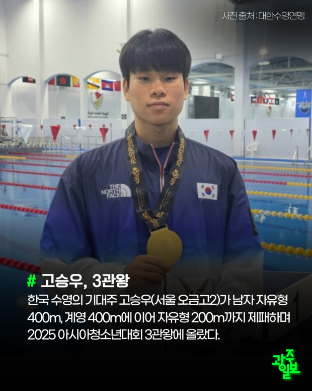 한국 수영의 기대주 고승우(서울 오금고2)가 남자 자유형 400m, 계영 400m에 이어 자유형 200m까지 제패하며 2025 아시아청소년대회 3관왕에 올랐다.