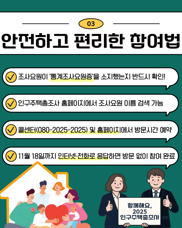 조사요원은 지방자치단체와 국가데이터처가 발급한 통계조사요원증을 소지하므로 도착 시 신분을 꼭 확인해야 하며, 방문시간 예약 및 문의는 인구주택총조사 홈페이지 또는 콜센터를 통해 가능하다. 한편 표본가구는 방문조사 기간에도 인터넷과 전화로 언제든 총조사에 참여할 수 있다.