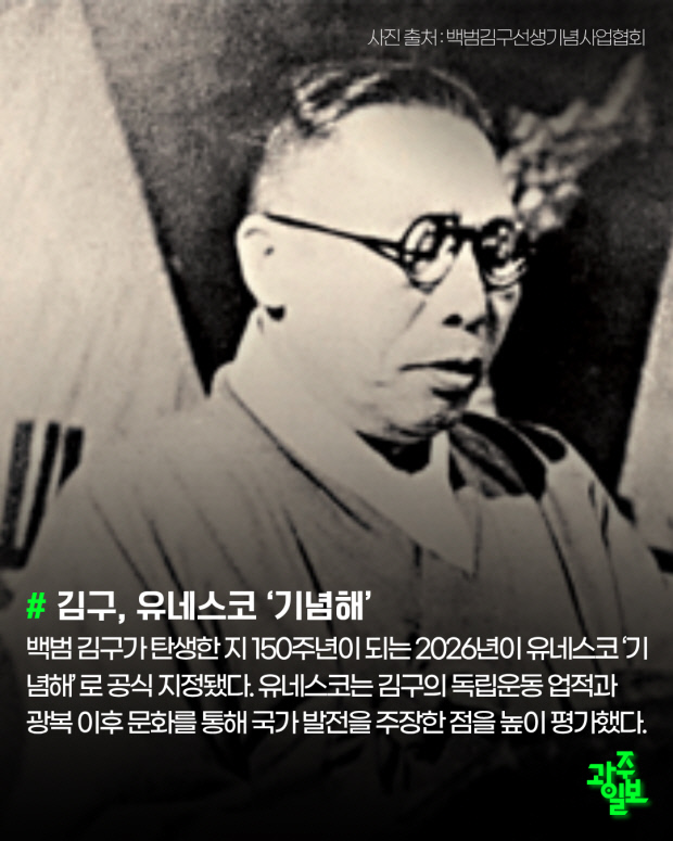 백범 김구가 탄생한 지 150주년이 되는 2026년이 유네스코 ‘기념해’로 공식 지정됐다. 유네스코는 김구의 독립운동 업적과 광복 이후 문화를 통해 국가 발전을 주장한 점을 높이 평가했다.