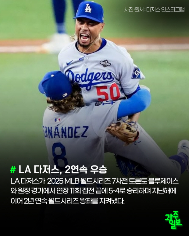 LA 다저스가 2025 MLB 월드시리즈 7차전 토론토 블루제이스와 원정 경기에서 연장 11회 접전 끝에 5-4로 승리하며 지난해에 이어 2년 연속 월드시리즈 왕좌를 지켜냈다.
