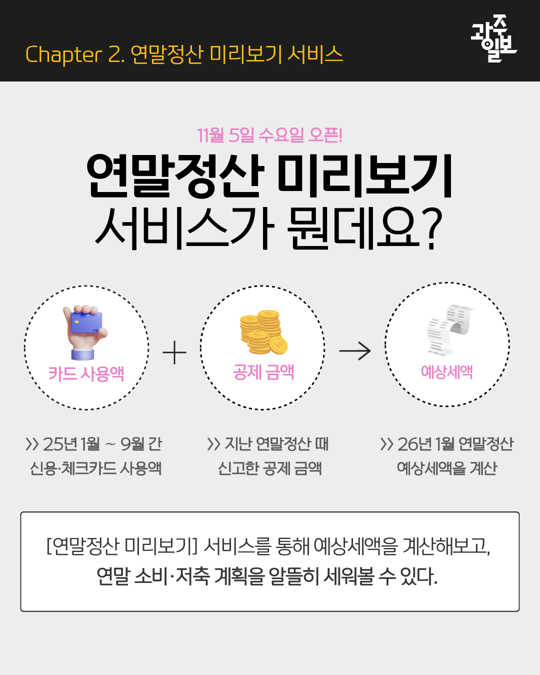 5일 국세청에 따르면 이날부터 홈택스에서 ‘연말정산 미리보기’ 서비스를 개시하고, 올 9월까지 신용·체크카드 등 사용액과 지난해 연말정산 때 신고한 공제 금액을 바탕으로 내년 1월 연말정산 예상 세액을 계산할 수 있도록 돕고 있다.
