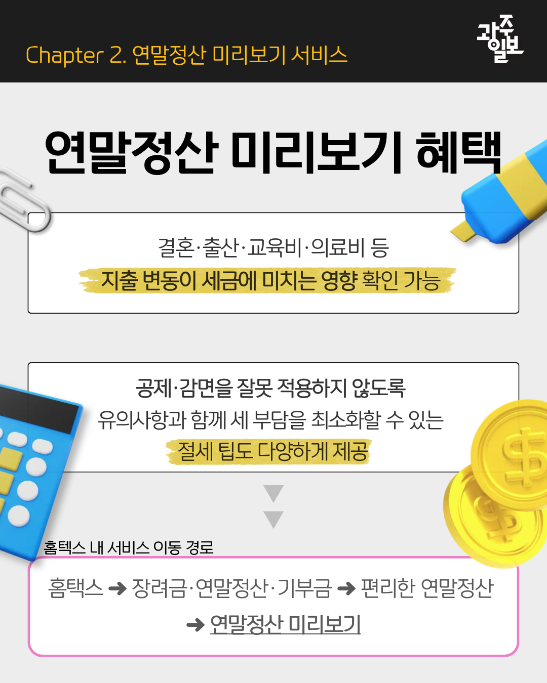 이용 방법은 홈택스 로그인 후 ‘장려금·연말정산·기부금’ 탭에서 ‘편리한 연말정산’, ‘연말정산 미리보기’를 선택하면 된다.