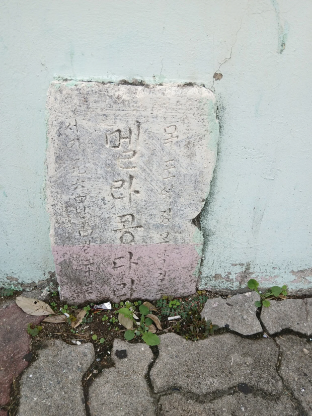 전봇대 아래 방치된 ‘멜라콩 다리’ 기념비에는 ‘목포시 정모(짐꾼) 박길수’라고 새겨져 있다. 부도난 호텔(옛 남일극장) 인근 도로를 횡단하는 도보다리를 박 선생이 앞장서서 세웠다.