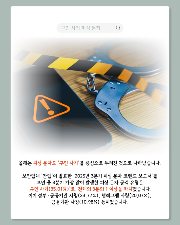 보안업체 ‘안랩’이 발표한 ‘2025년 3분기 피싱 문자 트렌드 보고서’를 보면 올 3분기 가장 많이 발생한 피싱 문자 공격 유형은 ‘구인 사기(35.01%)’로, 전체의 3분의 1 이상을 차지했습니다. 이어 정부·공공기관 사칭(23.77%), 텔레그램 사칭(20.07%), 금융기관 사칭(10.98%) 등이었습니다.
