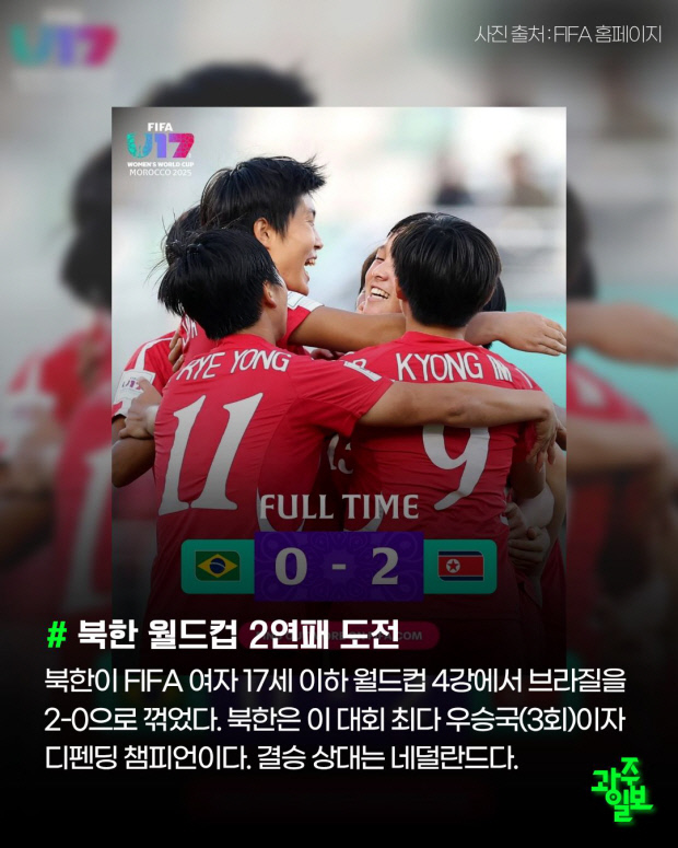북한이 FIFA 여자 17세 이하 월드컵 4강에서 브라질을 2-0으로 꺾었다. 북한은 이 대회 최다 우승국(3회)이자 디펜딩 챔피언이다. 결승 상대는 네덜란드다.