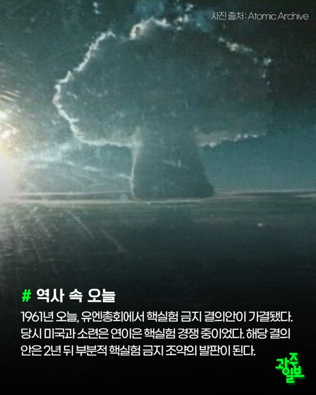 1961년 오늘, 유엔총회에서 핵실험 금지 결의안이 가결됐다. 당시 미국과 소련은 연이은 핵실험 경쟁 중이었다. 해당 결의안은 2년 뒤 부분적 핵실험 금지 조약의 발판이 된다.