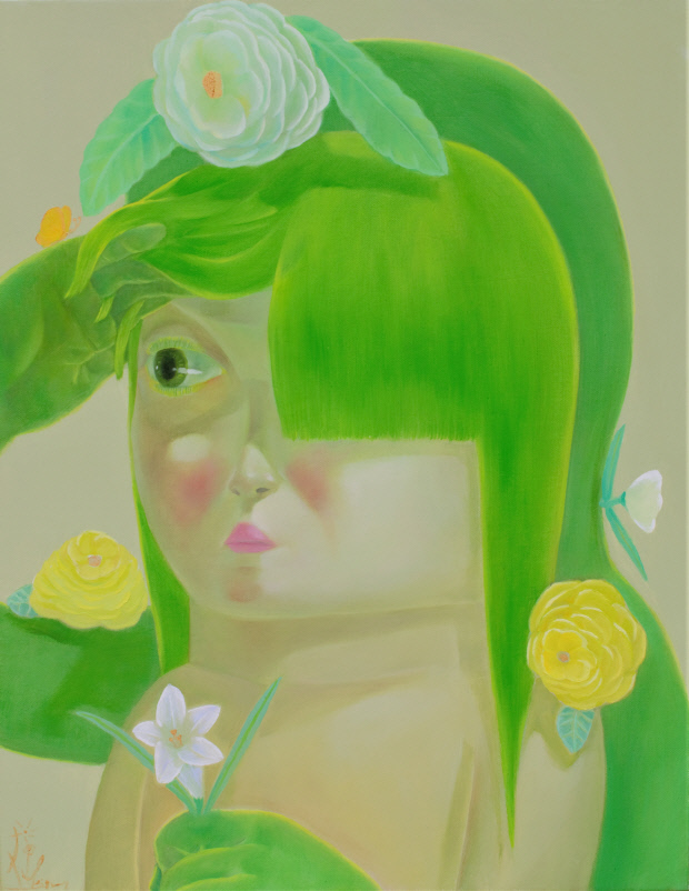 문선미 작가의 ‘I see you’는 초록의 머리카락을 길게 늘어뜨린 여성을 초점화했다. 왼쪽 눈을 머리카락이 덮은 모습은 보고 있으되 반만 보고 있다는 의미로 다가온다. 아름다운 꽃을 머리에 꽂고 가슴에 달았지만 전체적으로 분위기는 우울하다. 어쩌면 여성이 보는 대상은 대상 너머의 어떤 그림자와 같은 존재인지 모른다.