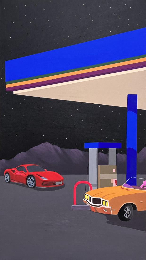 임은결의 ‘충전’은 주유소에서 주유를 하고 있는 순간을 초점화한 작품이다. 자동차에 가스를 충전하는 것은 달리 말하면 자동차를 살아 있는 존재로 인식한다는 의미일 수도 있다. 회색의 바닥, 어두운 하늘과 대비되는 주유소와 자동차의 화려한 색감이 ‘충전’의 의미를 증폭시킨다.