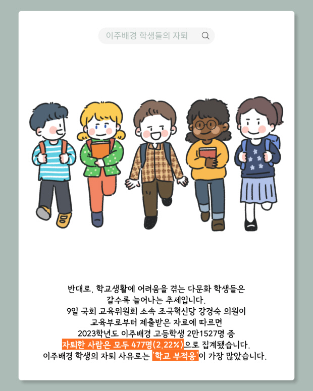 반대로, 학교생활에 어려움을 겪는 다문화 학생들은 갈수록 늘어나고 있습니다. 9일 국회 교육위원회 소속 조국혁신당 강경숙 의원이 교육부로부터 제출받은 자료에 따르면 2023학년도 이주배경 고등학생 2만1527명 중 자퇴한 사람은 모두 477명(2.22%)으로 집계됐습니다.