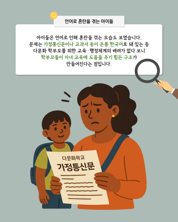 이주배경 학생의 자퇴 사유로는 ‘학교 부적응’이 가장 많았습니다. 문제는 가정통신문이나 교과서 등이 온통 한국어로 돼 있는 등 다문화 학부모를 위한 교육·행정체계의 배려가 없다 보니 학부모들이 자녀 교육에 도움을 주기 힘든 구조가 만들어진다는 점입니다.
