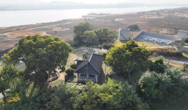 ![]() 수령 300년을 넘긴 팽나무 아래에 자리한 성모승천성당 주변으로 신석복 마르코 기념성당과 낙동강이 어우려져 보인다. |