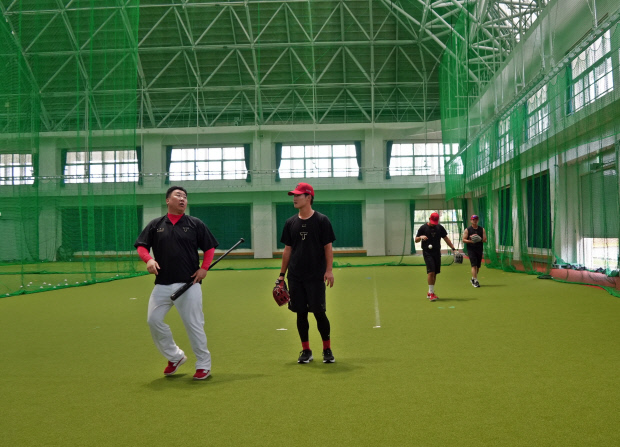 ![]() KIA 타이거즈 이범호 감독이 11일 일본 오키나와 킨구장 실내 연습장에서 박헌에게 수비 지도를 하고 있다. |